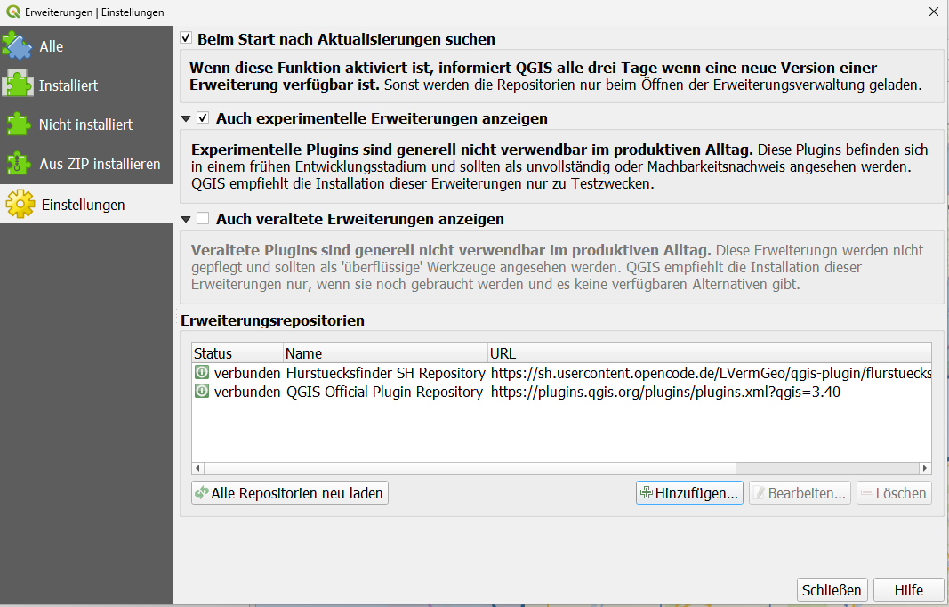 Jedoch steht ein QGIS kompatibles Repository zur Verfügung, welches sich als Alternative direkt in QGIS einbinden lässt:
